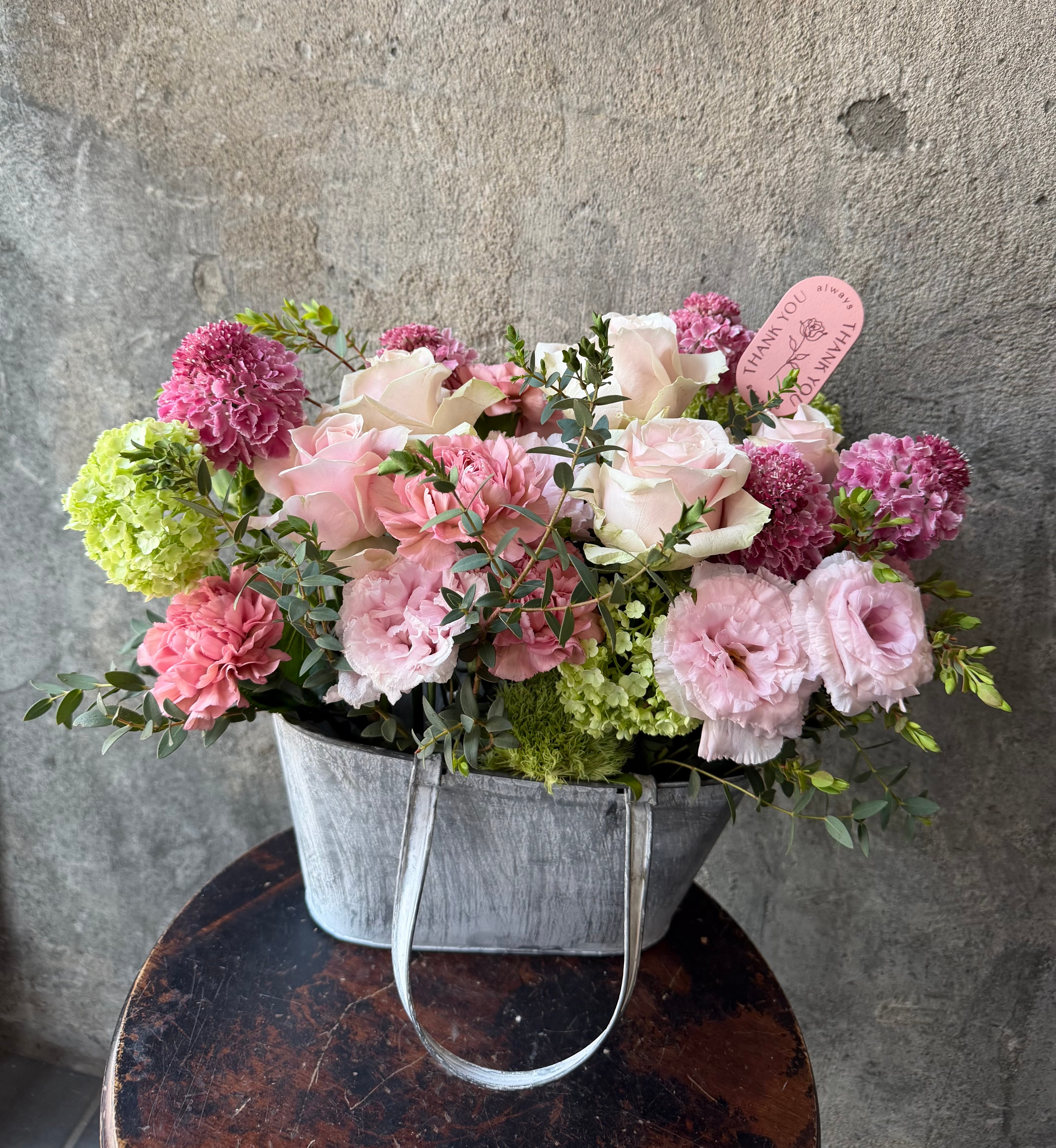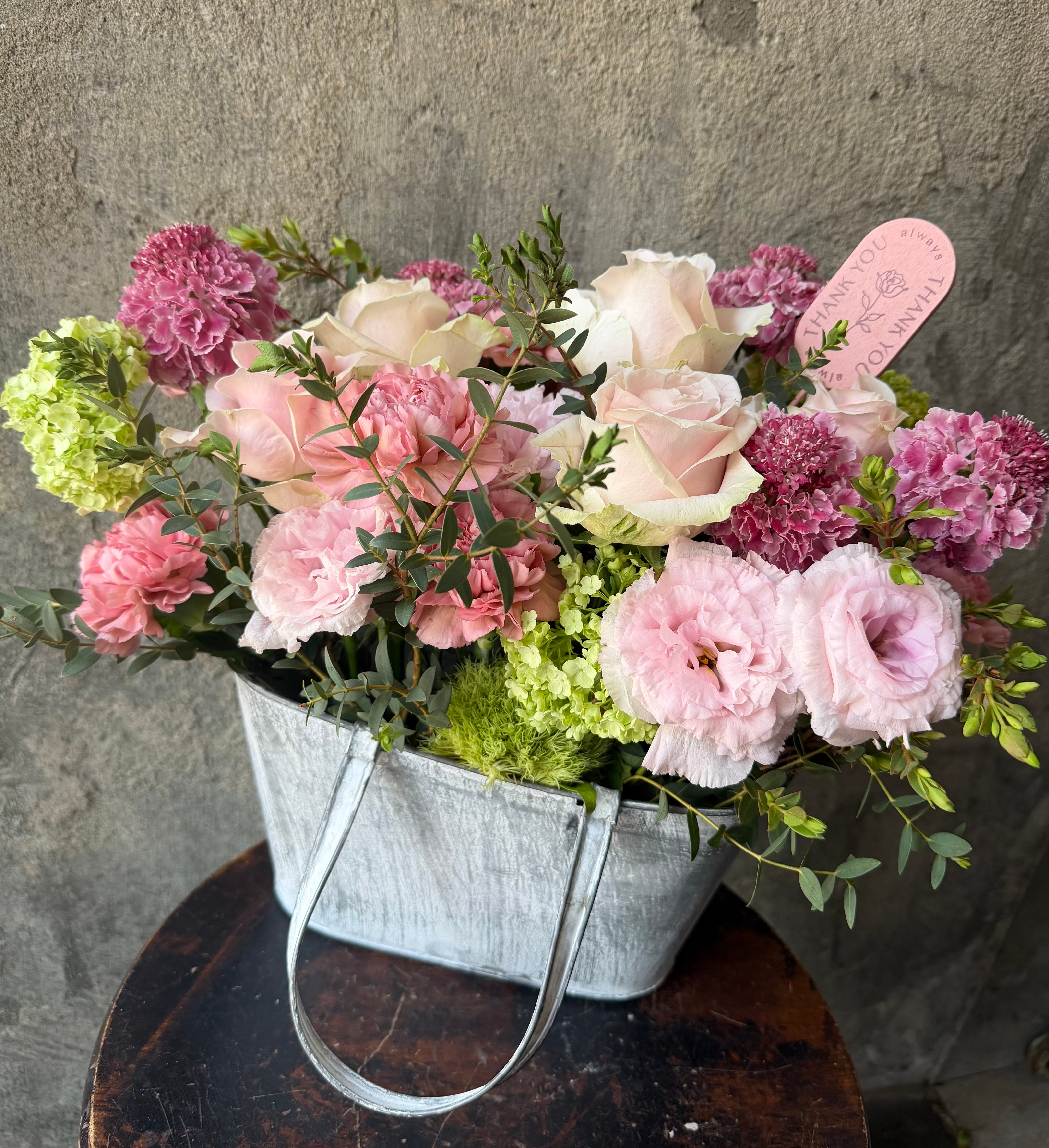 ①ブリキバックにお花を盛って!Merci maman!2026母の日アレンジ
